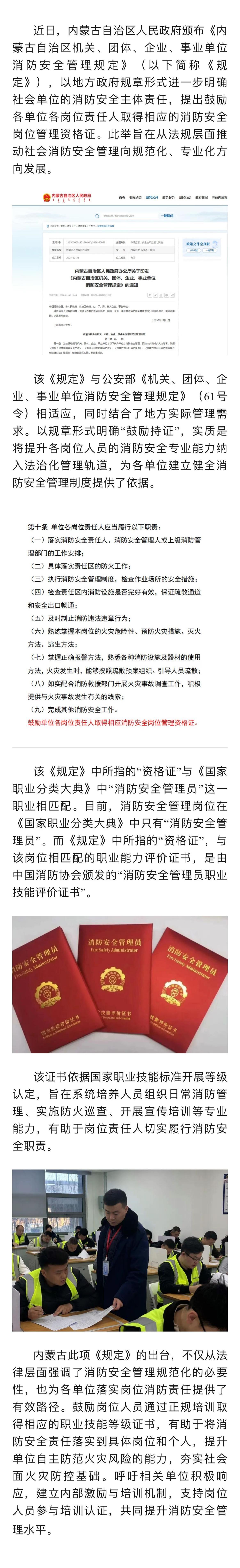 内蒙古政府规章:鼓励岗位责任人取得相应消防安全管理资格证