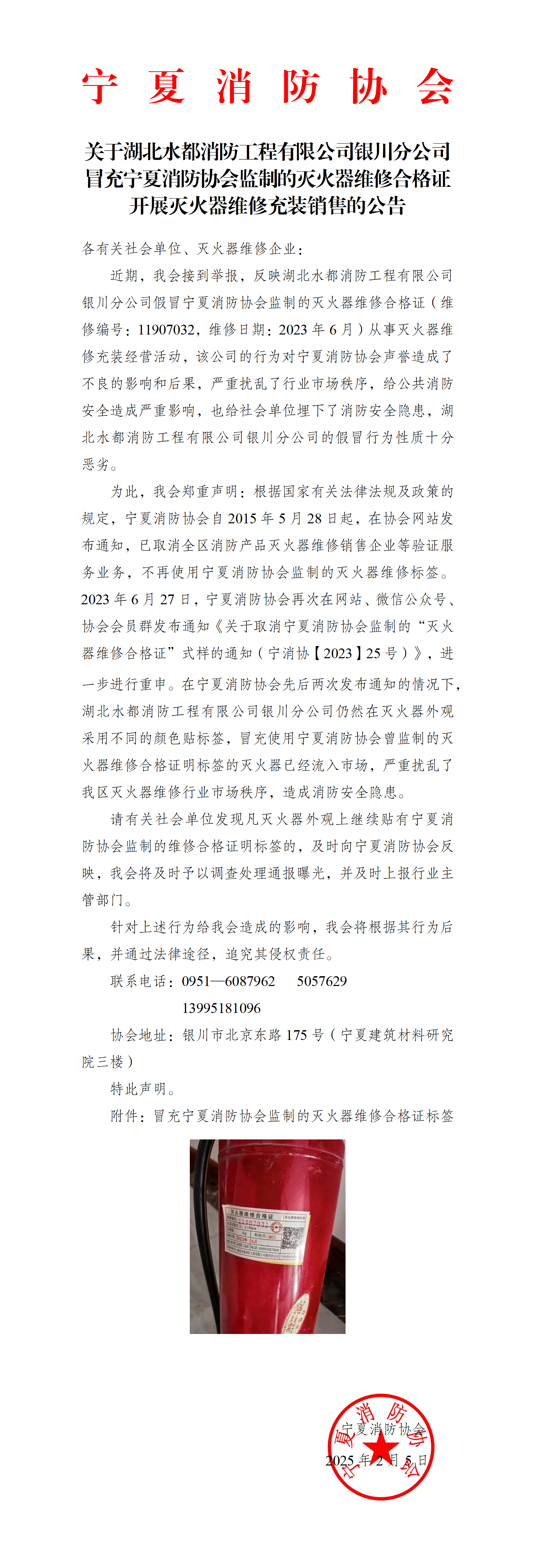 关于湖北水都消防工程有限公司银川分公司冒充宁夏消防协会监制的灭火器维修合格证开展灭火器维修充装销售的公告