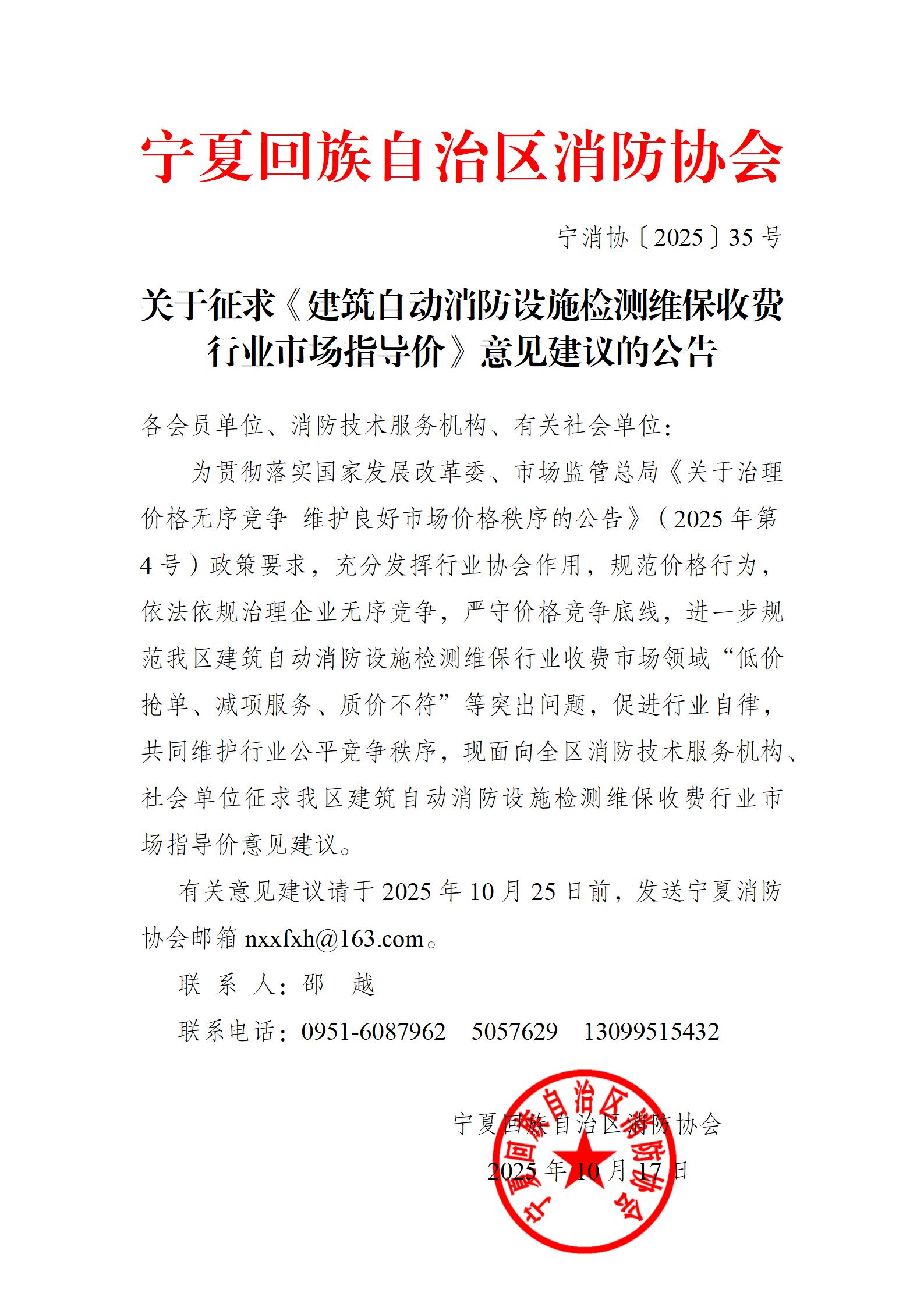关于征求建筑自动消防设施检测维保收费行业市场指导价意见建议的公告