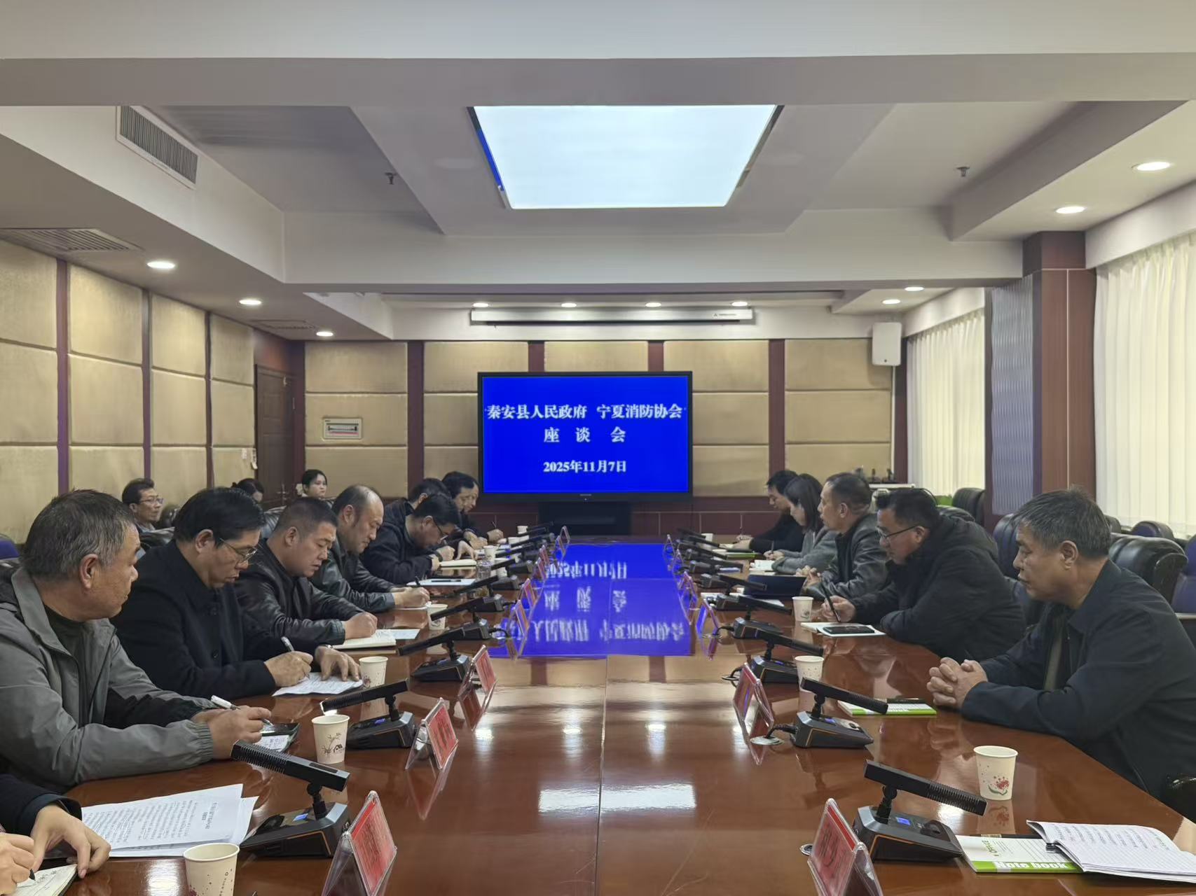 11月7日,宁夏回族自治区消防协会会长陈晓宏带领考察组一行前往秦安县开展考察调研活动,并出席当天考察座谈会。秦安县人民政府党组成员、副县长张小军主持会议并讲话。宁夏回族自治区消防协会副会长杨宗海、监事长刘正录、宁夏正祥实业集团有限公司副总裁张明芳、宁夏正祥消防职业技能培训学校杨雪、甘肃天水未来居新型环保建材有限公司董事长郭永红等考察组成员,以及秦安县县直相关部门负责人参加此次会议。