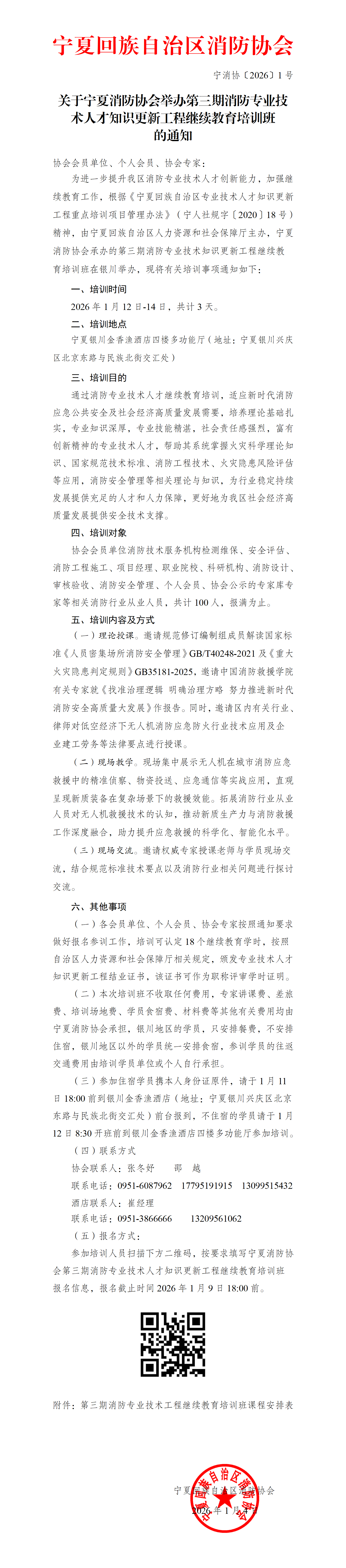 关于宁夏消防协会举办第三期消防专业技术人才知识更新工程继续教育培训班的通知