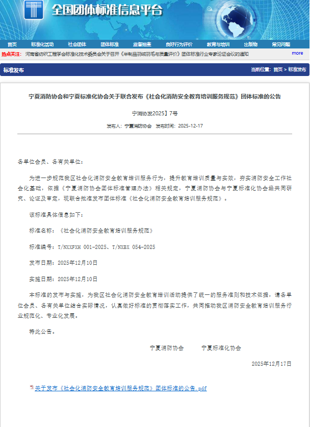 为进一步规范我区社会化消防安全教育培训服务行为,全面提升消防安全教育培训的质量与实效,筑牢消防安全工作社会化根基,宁夏消防协会依据《宁夏消防协会团体标准管理办法》,联合宁夏标准化协会,于2025年12月10日正式发布《社会化消防安全教育培训服务规范》(标准编号:T/NXXFXH 001-2025、T/NXBX 054-2025)团体标准。