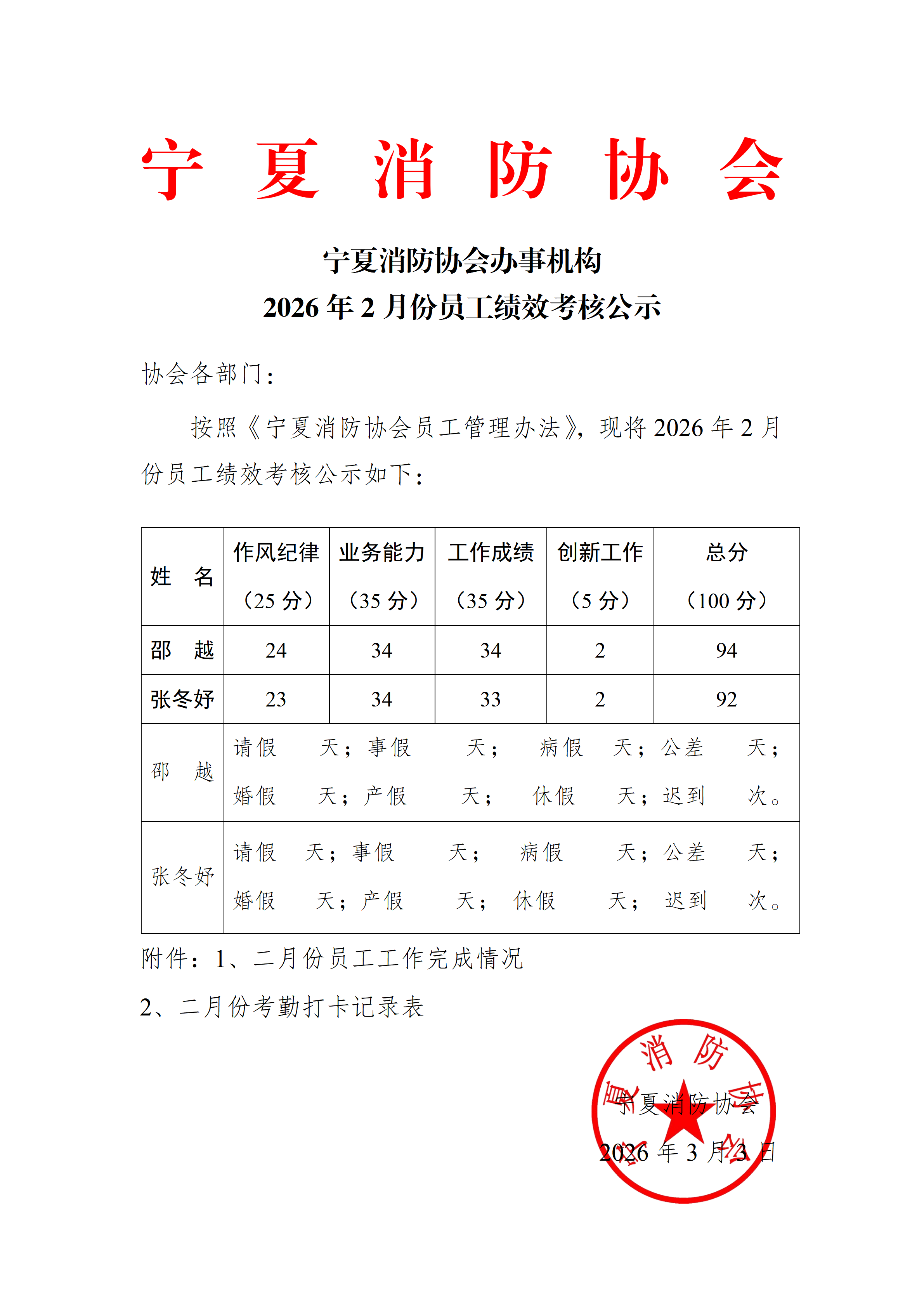 宁夏消防协会办事机构2026年2月份员工绩效考核公示