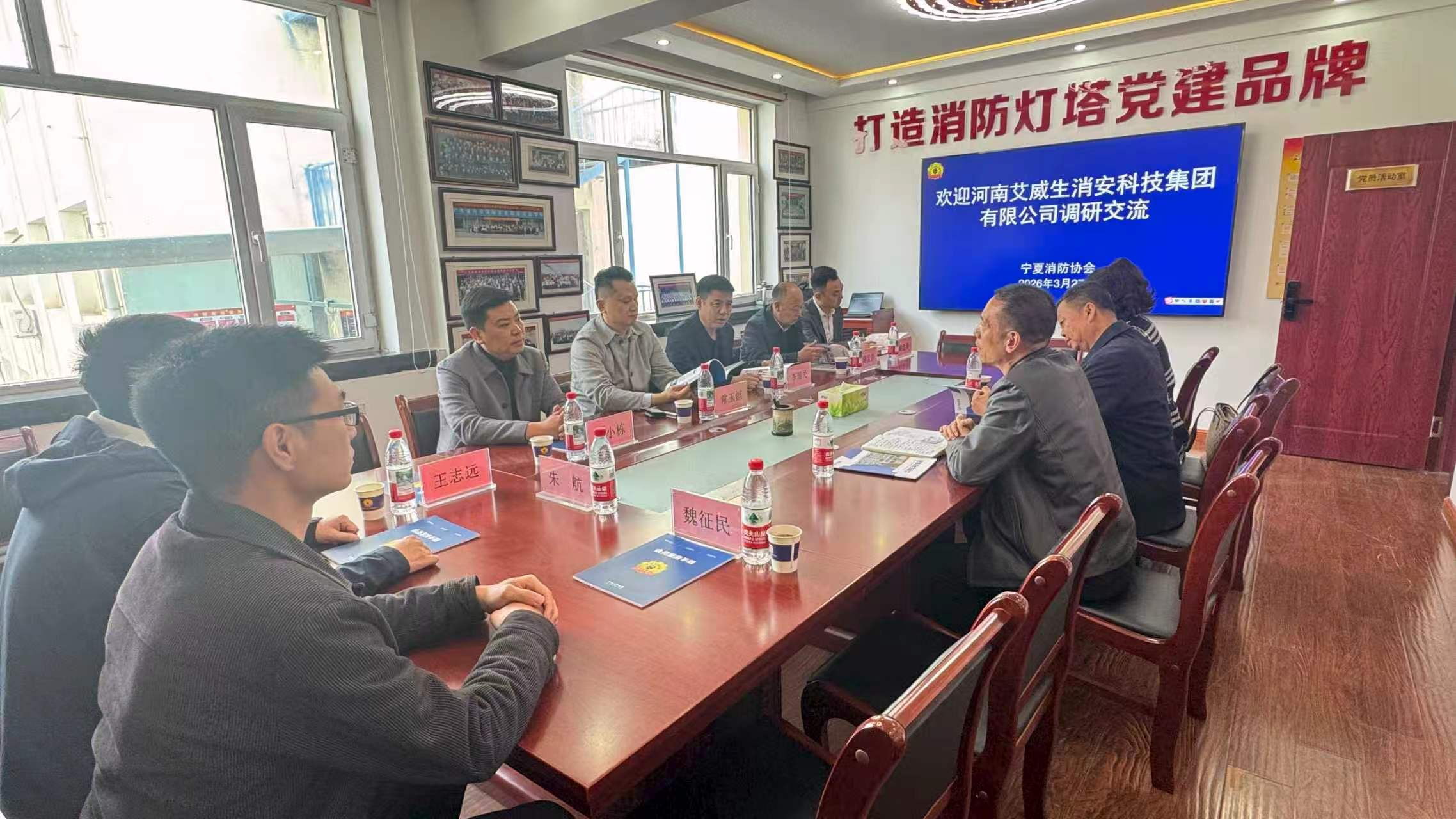 2026年3月27日上午,河南艾威生消安科技集团有限公司董事长常玉恒一行到宁夏消防协会走访调研交流。宁夏消防协会会长陈晓宏、副会长陆维杰、宁夏警官职业学院中职部副主任冯丽丽陪同调研。双方围绕防灾减灾、应急救援、专职消防员培养、实习就业、人力资源、智慧消防、行业市场运行等进行了深入探讨。